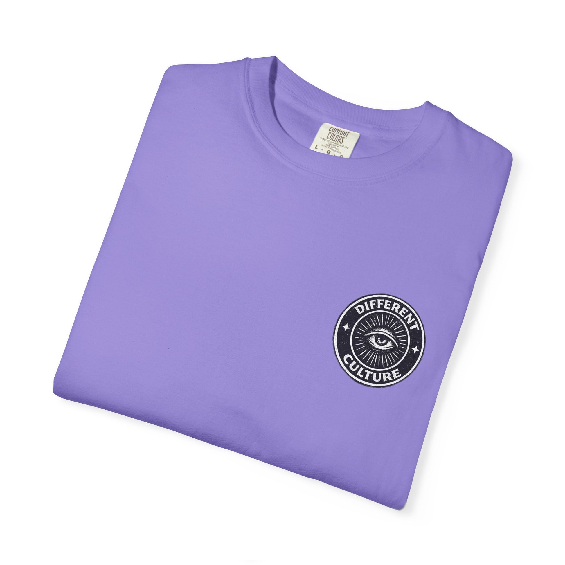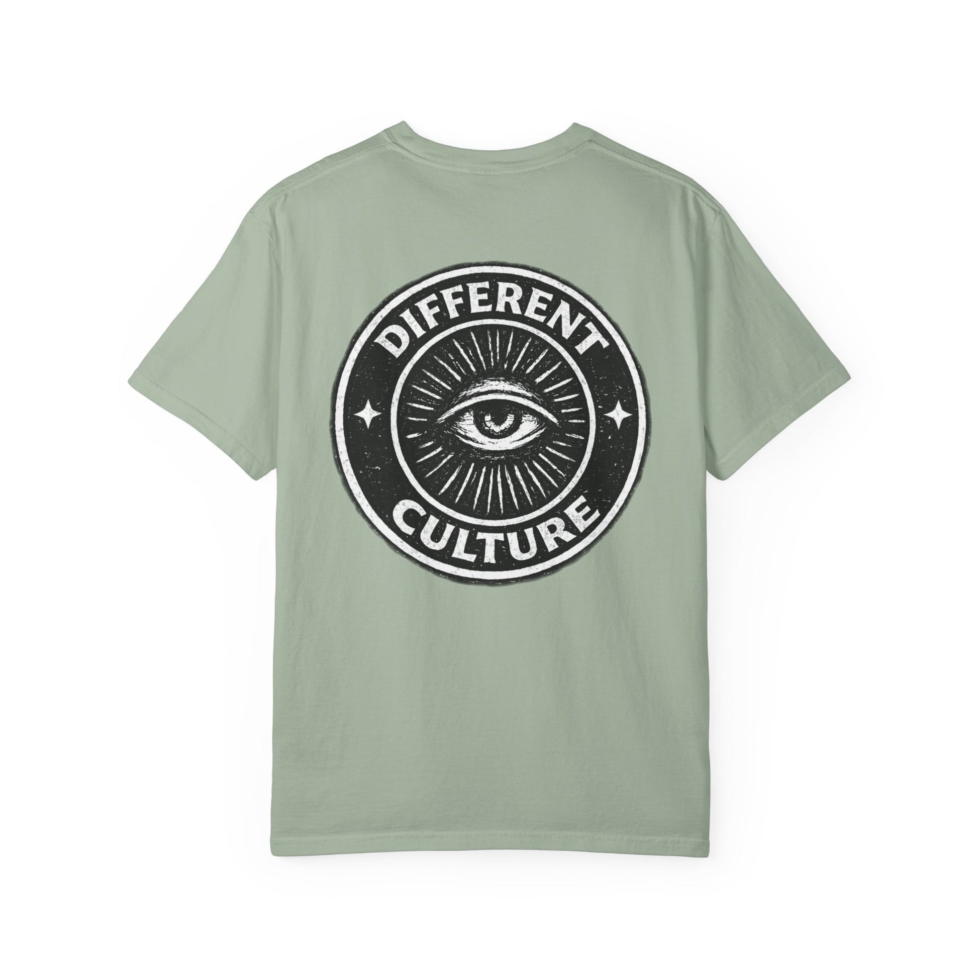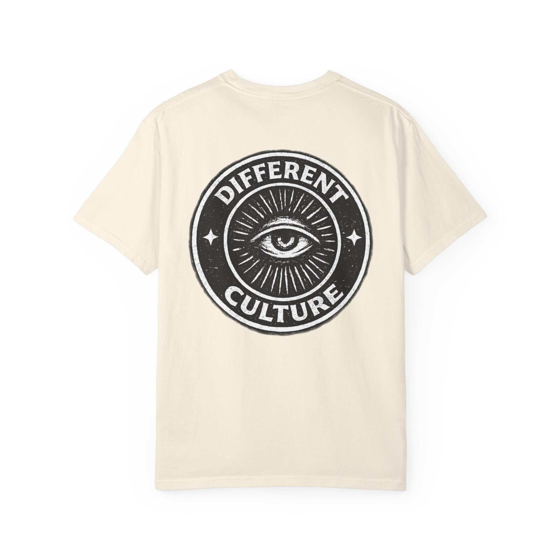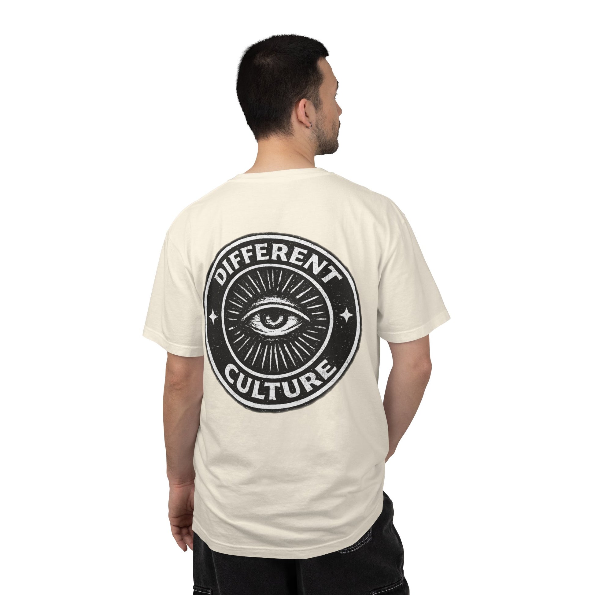 This heavyweight, garment-dyed tee brings quiet confidence to everyday wear. The soft, washed-in color and relaxed fit make it feel like an old favorite from the first wear, while the bold circular emblem — a watchful eye and the words “Different Culture” — speaks to someone who values individuality and subtle statement pieces. Wear it layered under a denim jacket for city nights, alone with worn-in jeans for gallery mornings, or tossed in your bag for weekend trips. The shirt settles into your routine: comfortable, lived-in, and quietly expressive.